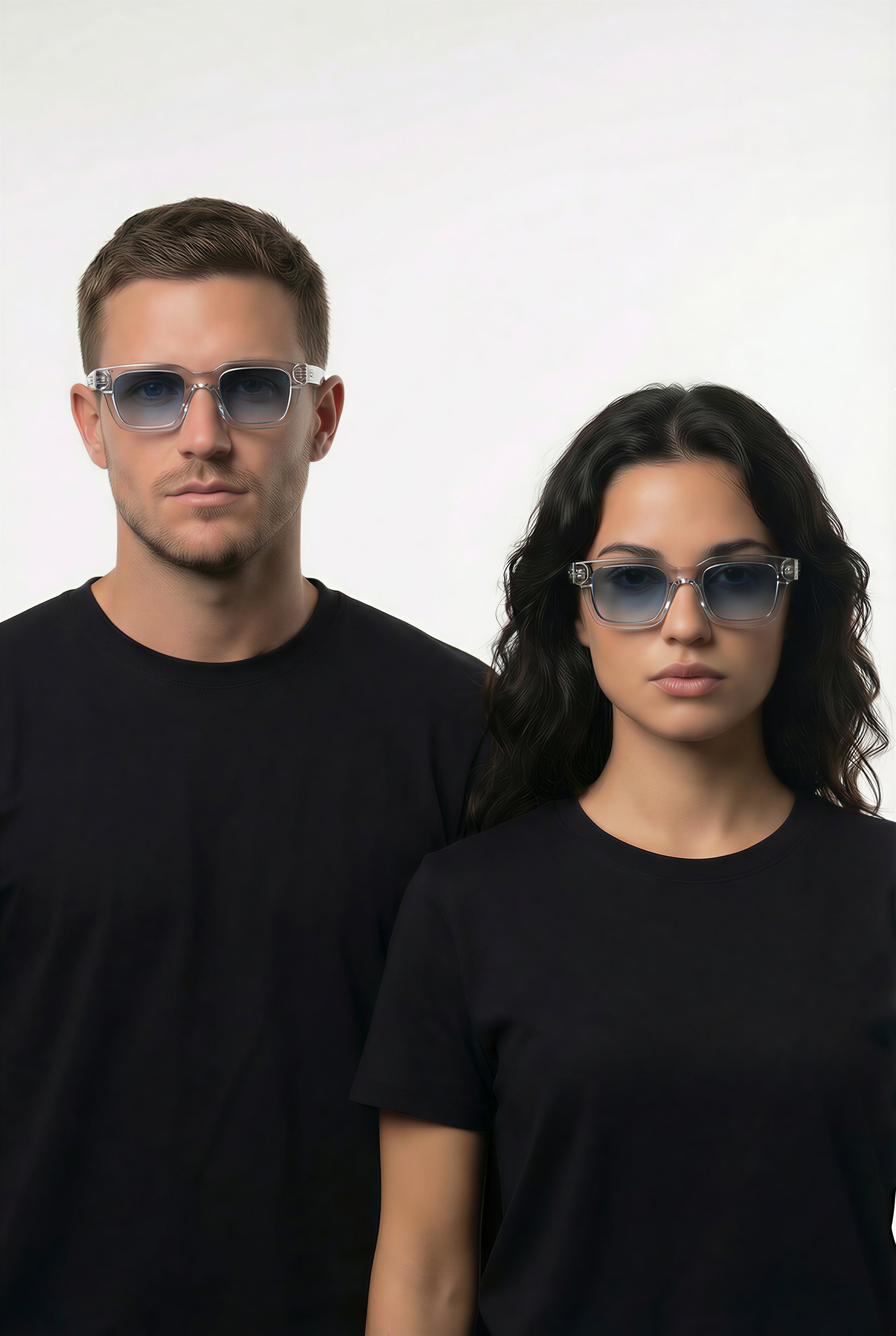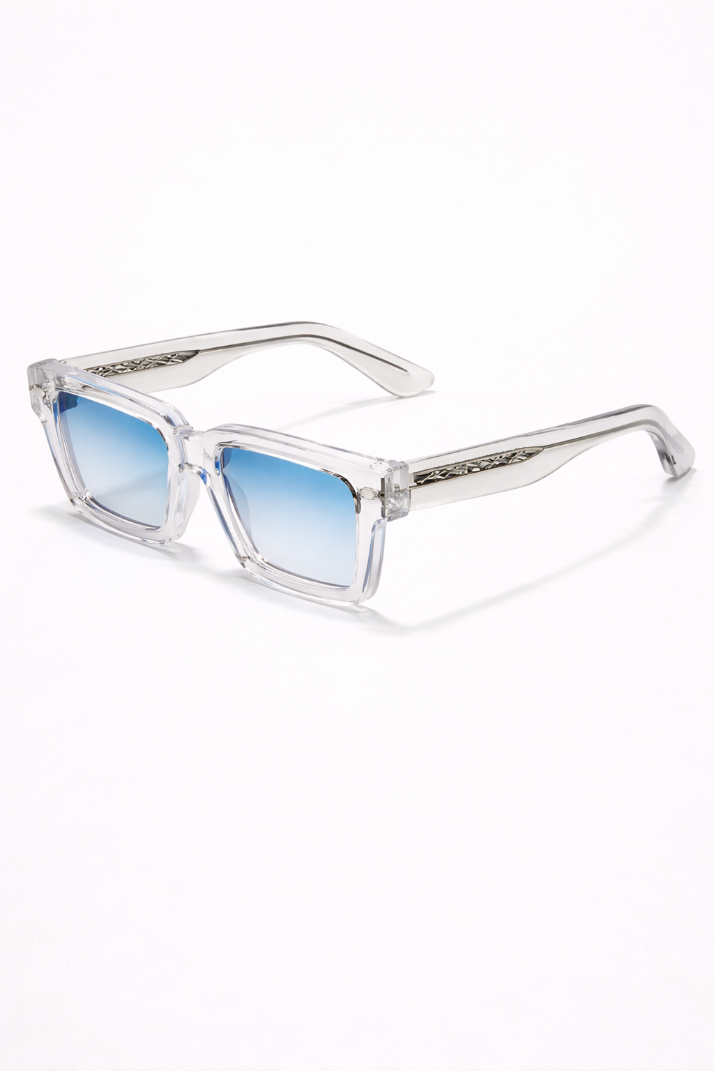 A timeless and stylish design with a square frame, crafted from high-quality polycarbonate material. The blue-tinted lenses add a modern touch, making them perfect for any look and occasion, day or night.